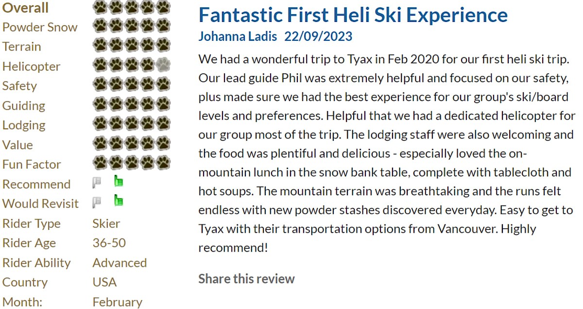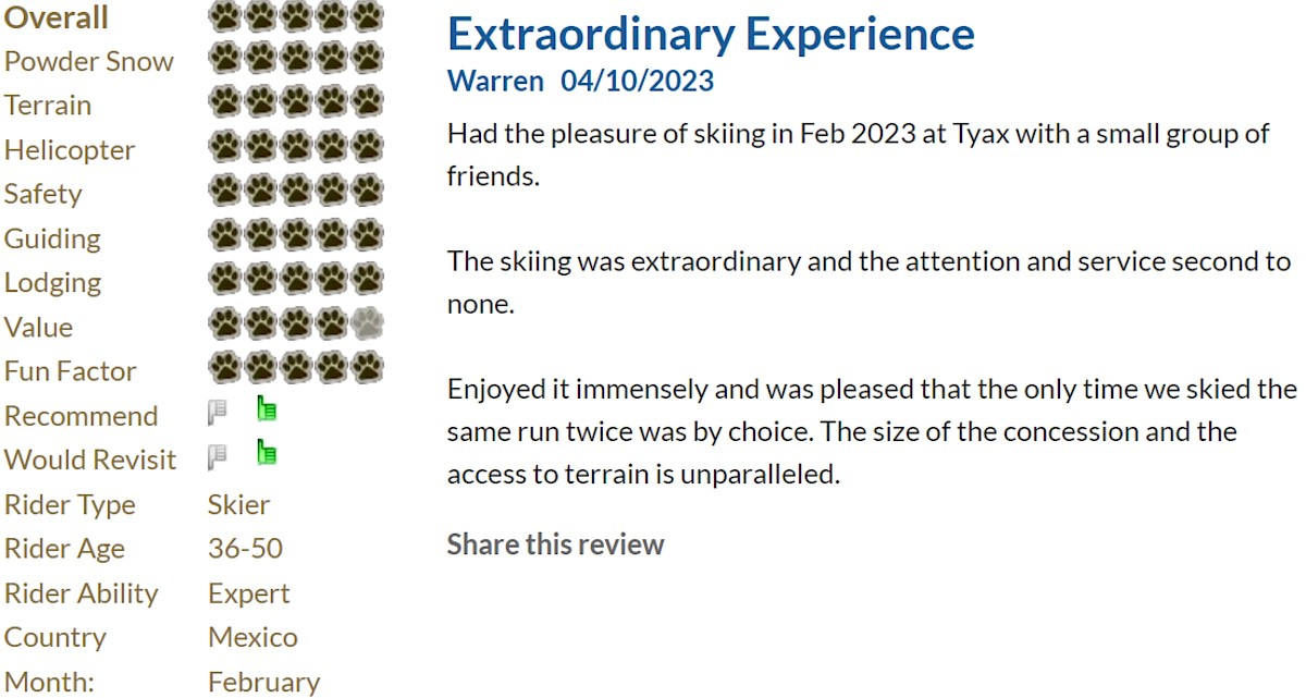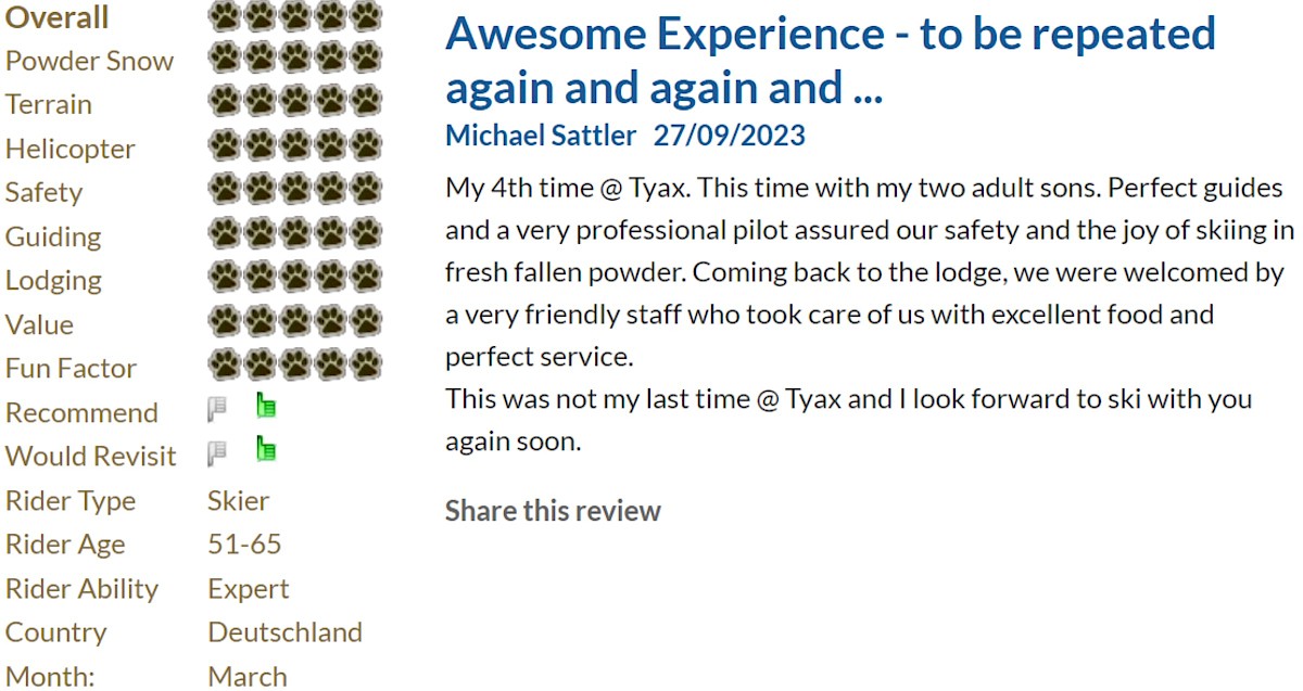 Tyax is fiercely independent. Tyax is privately owned. The team that runs Tyax live in the mountains, be it in Whistler, Squamish, Pemberton or the lodge area. We are mountain people. And we invite you to experience our hospitality and the unbelievable 1-group-per-helicopter heliskiing that we offer.