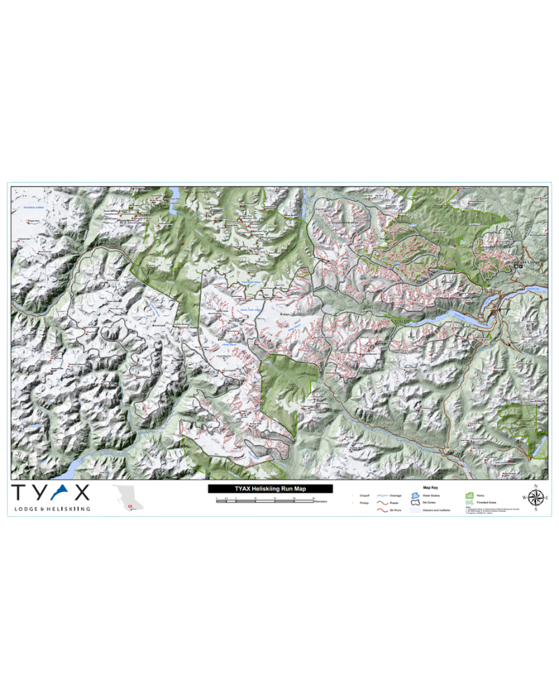 Unsere traumhafte Lodge liegt direkt am Tyaughton Lake auf einer Höhe von mehr als 1.000 Metern über dem Meeresspiegel. Das Tyax-Heliskigebiet ist mit 3.360 km² 200 Mal größer als Vail und 10 Mal größer als das größte Skigebiet Europas, Les 3 Vallées in Frankreich. Es vereint gigantische Gletscher, steile Couloirs, sanfte Almlandschaften und lichte Wälder für das berühmte „Tree Skiing“. Damit bieten wir das ideale Terrain für jeden vom Heliskiing-Firsttimer bis hin zum Profi. In unserem riesigen Areal haben wir fast 375 Runs kartographiert – und es werden immer mehr. Vielleicht bist Du ja dabei, wenn wir wieder eine neue Line entdecken.